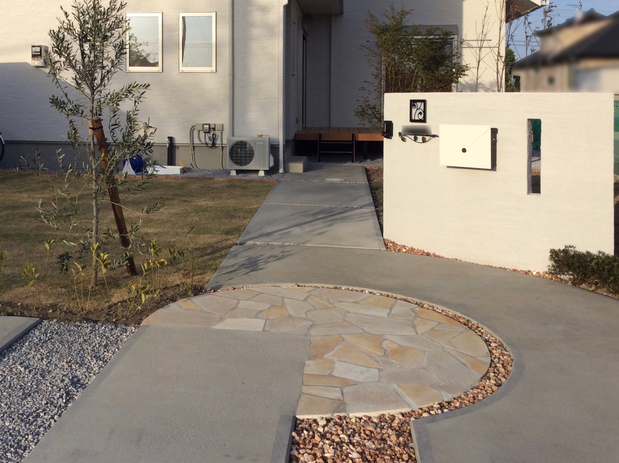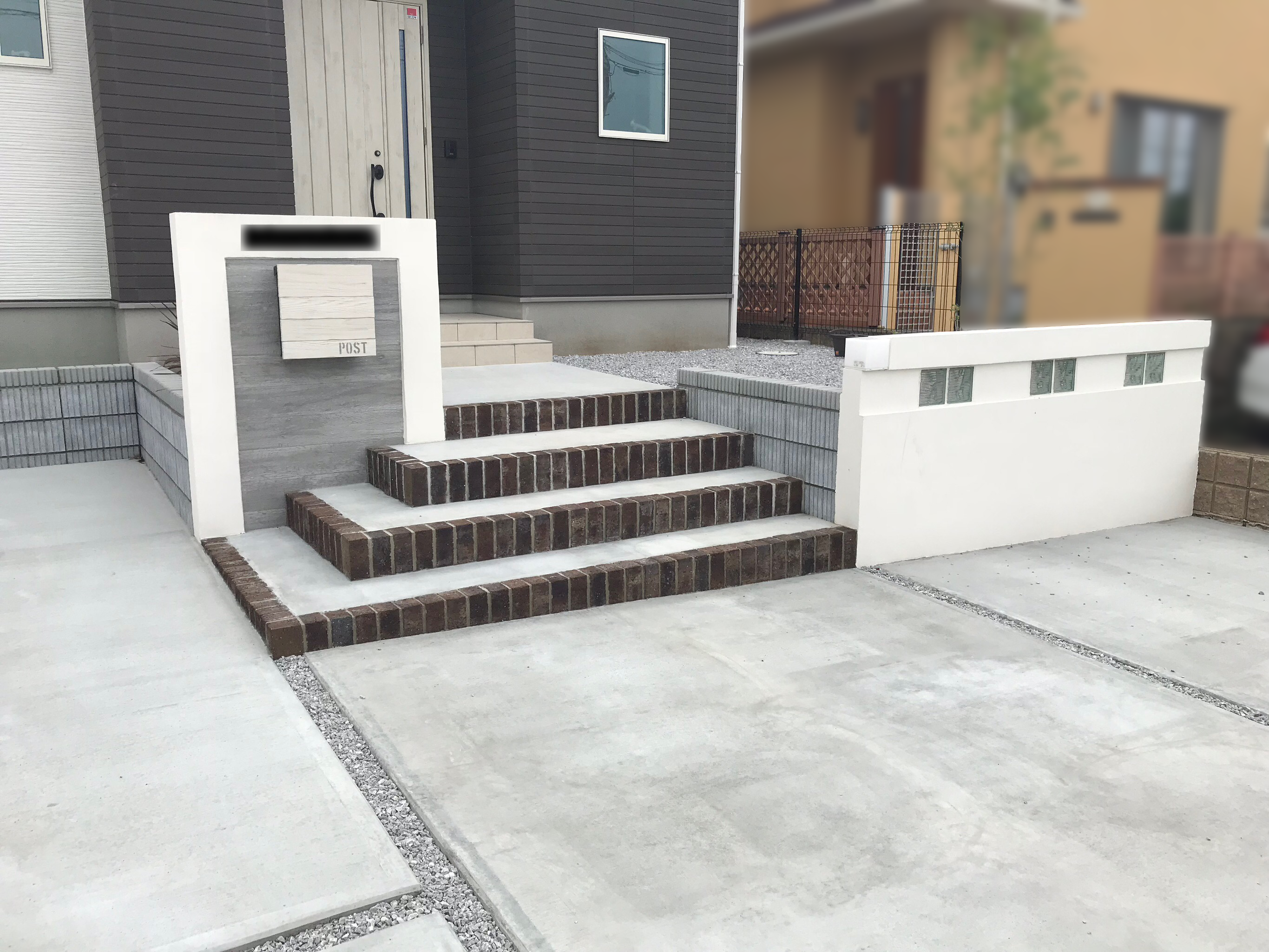門壁はタイルと塗壁、ポストは玄関ドアと合わせました。